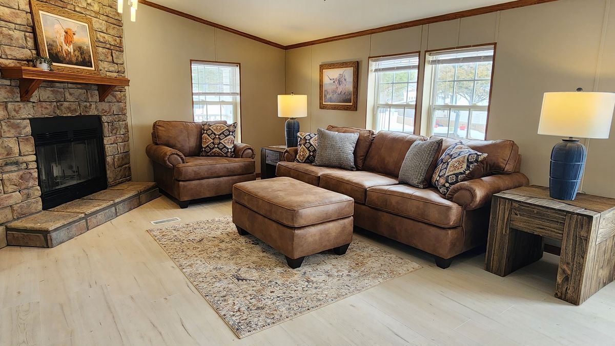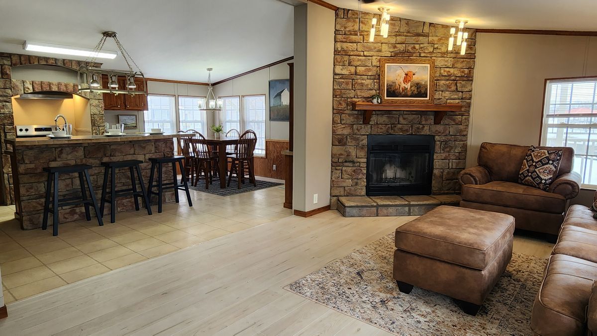 The living room is large enough for family gatherings that features a cozy rock front, wood burning fireplace.